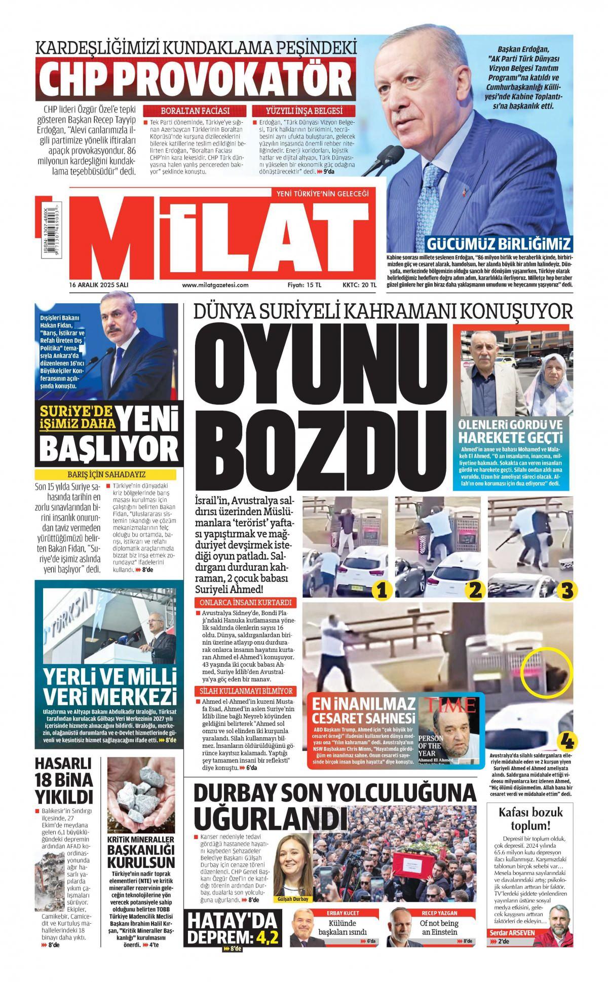 Milat Gazetesi 16 Aralık 2025 Günü Gazete Manşetleri