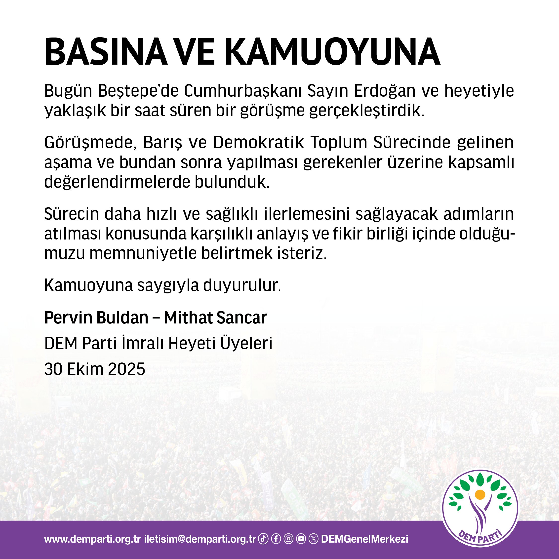 Dem Parti Genel Merkezinden “Umutla” Yola çıkan İmralı Heyeti, Beştedeki Cumhurbaşkanlığı Külliyesinden kısa bir basın açıklaması ile ayrıldı.