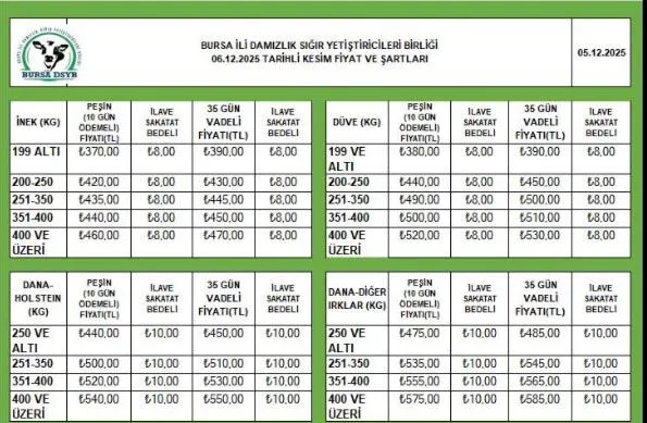 Bursa Damızlık Sığır Yetiştiricileri Birliği’nin açıkladığı 6 Aralık haftalık kesim fiyatları, kırmızı et piyasasında beklenmedik bir ayrışmaya işaret etti. Birlik verilerine göre inek kesim fiyatı 20 TL gerilerken, dana ve düve fiyatlarında hiçbir değişim yaşanmadı. Bu farklı hareket, sektör temsilcilerinin dikkatini Bursa’da yoğunlaştırdı.